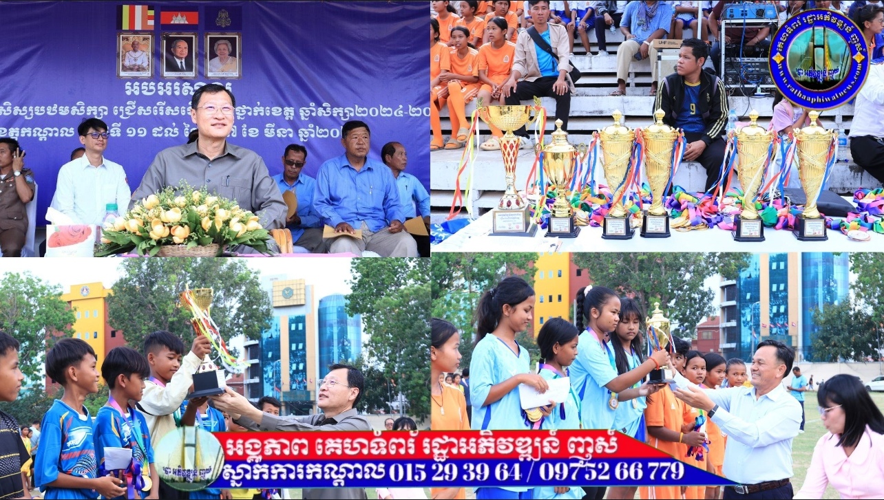 ខេត្តកណ្តាល៖ ការប្រកួតកីឡាសម្រាប់សិស្សបឋមសិក្សាជម្រើសជើងឯកថ្នាក់ខេត្ត ប្រចាំឆ្នាំ២០២៥ នាពេលនេះ គឺដើម្បីវាស់ស្ទង់កម្រិតបច្ចេកទេស និងជ្រើសរើសយកកីឡាករ កីឡាការិនី ដែលឆ្នើម នឹងមានទេពកោសល្យល្អមកប្រមូលផ្តុំហ្វឹកហាត់ ដើម្បីត្រៀមចូលរួមប្រកួតថ្នាក់ជាតិនាពេលខាងមុខ ឯកឧត្តម នុត ពុធដារ៉ា អភិបាលរងខេត្តកណ្តាល បានមានប្រសាសន៍បែបនេះ ក្នុងពិធីបិទការប្រកួតកីឡាសិស្សបឋមសិក្សាជ្រើសរើសជើងឯកថ្នាក់ខេត្ត ប្រចាំឆ្នាំសិក្សា២០២៤-២០២៥ នៅកីឡដ្ឋានខេត្តកណ្តាល ក្រុងតាខ្មៅ ខេត្តកណ្តាល នារសៀលថ្ងៃទី១៧ ខែមីនា ឆ្នាំ២០២៥នេះ ។