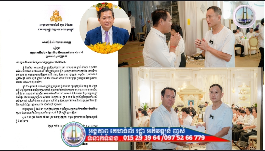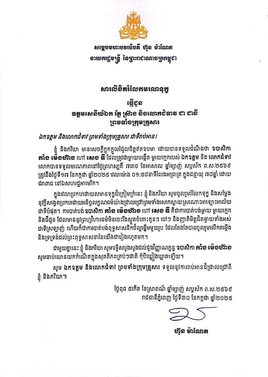 ភ្នំពេញ៖ សម្តេចមហាបវរធិបតី ហ៊ុន ម៉ាណែត នាយករដ្ឋមន្រ្តីនៃកម្ពុជា សូមផ្ញើសារលិខិតរំលែកទុក្ខជូន ឧត្តមសេនីយ៍ឯក រ័ត្ន ស្រ៊ាង មេបញ្ជាការរង កងរាជអាវុធហត្ថលើផ្ទៃប្រទេស មេបញ្ជាការ កងរាជអាវុធហត្ថរាជធានីភ្នំពេញ និងលោកជំទាវ ជា ដានី ព្រមទាំងក្រុមគ្រួសារ ចំពោះមរណភាពរបស់ឧបាសិកា កាំង ម៉េងហ៊ាង ហៅ សេង ឌី ដែលត្រូវជាម្តាយក្មេករបស់ ឯកឧត្តម នៅថ្ងៃព្រហស្បតិ៍ ទី១៧ ខែកក្កដា ឆ្នាំ២០២៥ ម៉ោង០១:៥៨នាទី រំលងអាធាត្រ (នៅសហរដ្ឋអាមេរិក) ក្នុងជន្មាយុ ៧៨ឆ្នាំ ដោយរោគាពាធ។