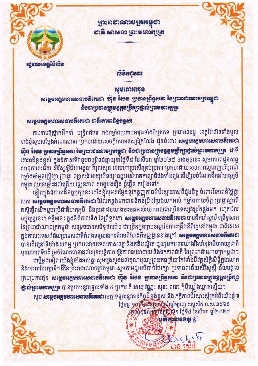 ប៉ៃលិន៖លោកជំទាវ បណ្ឌិតបាន ស្រីមុំ អភិបាលខេត្តប៉ៃលិន សូមផ្ញើសារលិខិតគោរពជូនពរ សម្តេចអគ្គមហាសេនាបតីតេជោ ហ៊ុន សែន ប្រធានព្រឹទ្ធសភា, នាយឧត្តមសេនីយ៍ផុតលេខផ្កាយមាស់៥ និងជាប្រធានក្រុមឧត្តមប្រឹក្សាផ្ទាល់ព្រះមហាក្សត្រ ក្នុងឱកាសដ៏មង្គលសួស្ដីប្រពៃថ្លៃថ្លា ចម្រើនជន្មាយុគម្រប់៧៣ឆ្នាំ ដែលនឹងប្រព្រឹត្តទៅនាថ្ងៃអង្គារ ១១កើត ខែស្រាពណ៍ ឆ្នាំម្សាញ់ សប្តស័ក ព.ស ២៥៦៩ ត្រូវនឹងថ្ងៃទី០៥ ខែសីហា ឆ្នាំ២០២៥។