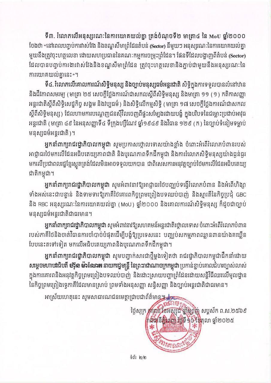 អ្នកនាំពាក្យរាជរដ្ឋាភិបាលកម្ពុជា សូមបញ្ជាក់សារជាថ្មីម្តងទៀតថា រាជរដ្ឋាភិបាលកម្ពុជាដឹកនាំដោយ សម្តេចមហាបវរធិបតី ហ៊ុន ម៉ាណែត នាយករដ្ឋមន្ត្រី នៃព្រះរាជាណាចក្រកម្ពុជា ប្រកាន់ខ្ជាប់គោលជំហរច្បាស់លាស់ ក្នុងការគោរពនិងអនុវត្តកិច្ចព្រមព្រៀងបទឈប់បាញ់ និងដោះស្រាយបញ្ហាព្រំដែនដោយសន្តិវិធីឈរលើមូលដ្ឋាន នៃកិច្ចព្រមព្រៀងទ្វេភាគីដែលមានស្រាប់ ព្រមទាំងអនុសញ្ញា សន្ធិសញ្ញា និងច្បាប់អន្តរជាតិជាធរមាន។