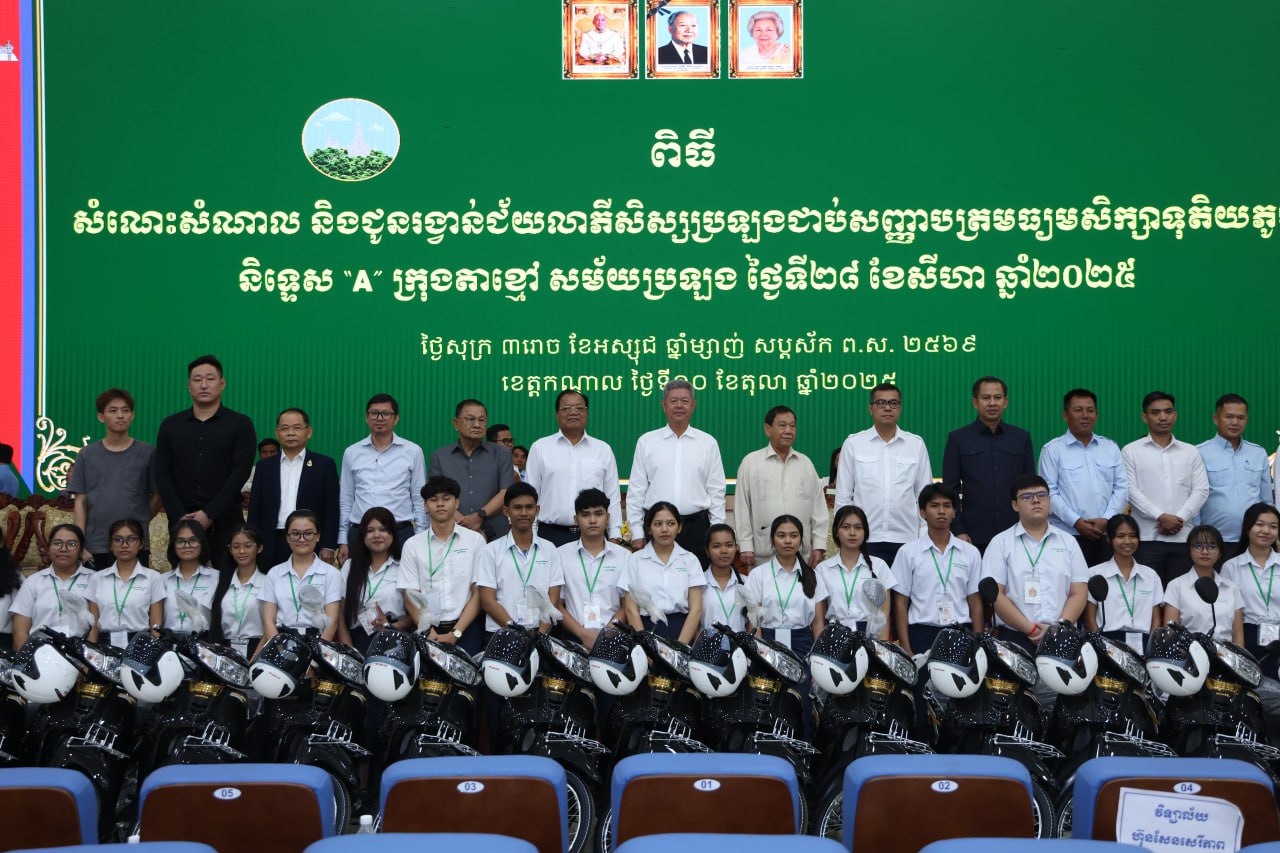 ខេត្តកណ្ដាល៖ ម៉ូតូចំនួន ៨០ គ្រឿង ត្រូវបានផ្ដល់ជូនសិស្សប្រឡងជាប់និទ្ទេស A សញ្ញាប័ត្រមធ្យមសិក្សាទុតិយភូមិ សម័យប្រឡងថ្ងៃទី២៨ ខែសីហា ឆ្នាំ២០២៥ ដោយឯកឧត្តម នូ សាខន ប្រធានក្រុមប្រឹក្សាខេត្តកណ្ដាល និងឯកឧត្តម គួច ចំរើន អភិបាល នៃគណៈអភិបាលខេត្តកណ្ដាល នាព្រឹកថ្ងៃទី១០ ខែតុលា ឆ្នាំ២០២៥នេះ។
