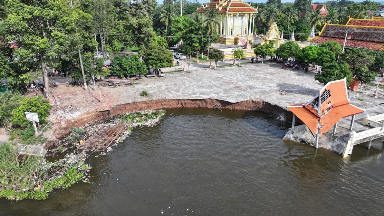ខេត្តកណ្តាល៖ ច្រាំងមាត់ស្ទឹង ស្ថិតក្នុងឃុំលើកដែក រងការបាក់ស្រុត បណ្តាលមកពីទឹកទន្លេមេគង្គ និងទឹកទន្លេបាសាក់ហូរចូលតាមព្រែកលើកដែក មកប្រសព្វត្រង់ចំណុចមុខវត្តជ្រោយ ស្ថិតនៅក្នុងភូមិសាស្ត្រស្រុកកោះធំ នារសៀលថ្ងៃទី២១ ខែតុលា ឆ្នាំ២០២៥នេះត្រូវបាន ឯកឧត្តម គួច ចំរើន អភិបាល នៃគណៈអភិបាលខេត្តកណ្តាល ដឹកនាំមន្ទីរជំនាញ មន្ត្រីបច្ចេកទេស អាជ្ញាធរដែនដី ព្រះសង្ឃ និងប្រជាពលរដ្ឋចំណុះជើងវត្ត ចុះពិនិត្យជាក់ស្តែងទីតាំងមាត់ស្ទឹងលើកដែក ដែលរងការបាក់ច្រាំង នៅចំណុចវត្តជ្រោយ ភូមិអន្លង់ស្លាត ឃុំលើកដែក ស្រុកកោះធំ ខេត្តកណ្តាល។