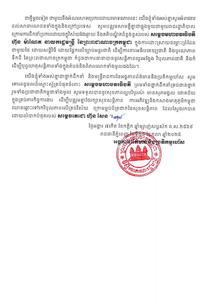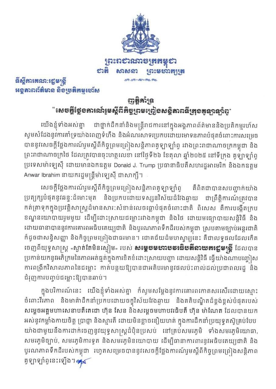 ថ្នាក់ដឹកនាំនិងមន្ត្រីរាជការនៅក្នុងអង្គភាពព័ត៌មាននិងប្រតិកម្មរហ័ស សូមសំដែងនូវការគាំទ្រយ៉ាងពេញទំហឹង និងអំណរសាទរប្រកបដោយមោទភាពបំផុត ចំពោះការសម្រេចបាននូវសេចក្ដីថ្លែងការណ៍រួមស្ដីពីកិច្ចព្រមព្រៀងសន្តិភាពគូឡាឡាំពួ រវាងព្រះរាជាណាចក្រកម្ពុជា និងព្រះរាជាណាចក្រថៃ ដែលត្រូវបានចុះហត្ថលេខា នៅថ្ងៃទី២៦ ខែតុលា ឆ្នាំ២០២៥ នៅទីក្រុងគូឡាឡាំពួ ប្រទេសម៉ាឡេស៊ី ដោយមានឯកឧត្តម Donald J. Trump ប្រធានាធិបតីសហរដ្ឋអាមេរិក និងឯកឧត្តម Anwar Ibrahim នាយករដ្ឋមន្ត្រីម៉ាឡេស៊ីជាសាក្សី។