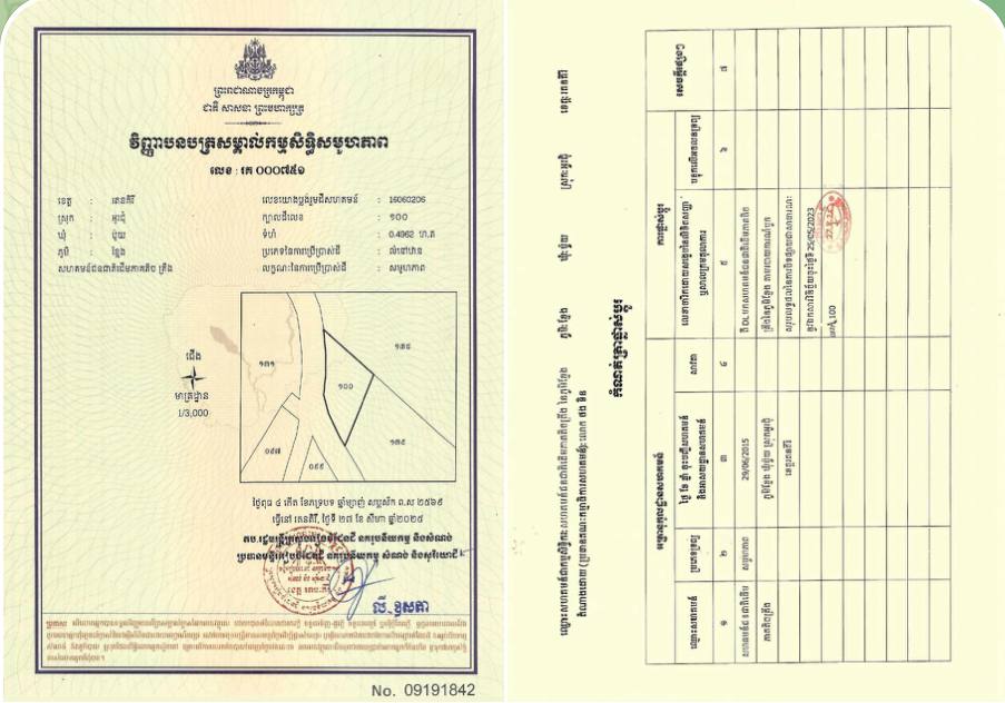 ៤. ក្បាលដីលេខ ១០០ មានទំហំ ០.៤៩៦២ ហិកតា ស្ថិតនៅភូមិខ្មែង ឃុំប៉ូយ ស្រុកអូរជុំ ខេត្តរតនគិរី។