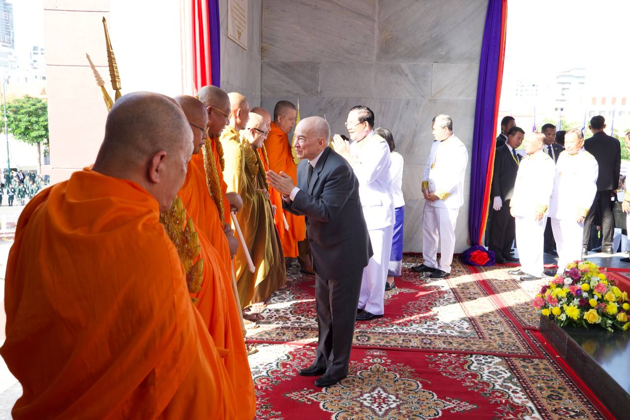 ក្នុងព្រះរាជពិធីនាព្រឹកមិញនេះ ព្រះមហាក្សត្រ បានស្តេចយាងដាក់កម្រងផ្កាគោរពព្រះវិញ្ញាណក្ខន្ធវីរយុទ្ធជន យុទ្ធនារីខ្មែរ ដែលបានតស៊ូ និងធ្វើពលីកម្មក្នុងការទាមទារឯករាជ្យជាតិ បន្ទាប់មកព្រះអង្គបានយាងប្រោសប្រទានភ្លើងជ័យ។