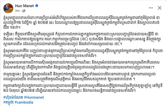 កម្ពុជានៅរក្សាជំហរក្នុងការដោះស្រាយបញ្ហាដោយសន្តិវិធី ស្របតាមស្មារតីនៃសេចក្តីថ្លែងការណ៍រួមទីក្រុងគូឡាឡាំពួ នៅថ្ងៃទី ២៦ ខែតុលា ឆ្នាំ២០២៥ ដើម្បីឈានទៅដល់ការបញ្ចប់ជម្លោះ និងកសាងសន្តិភាពរវាងប្រទេសទាំងពីរ។