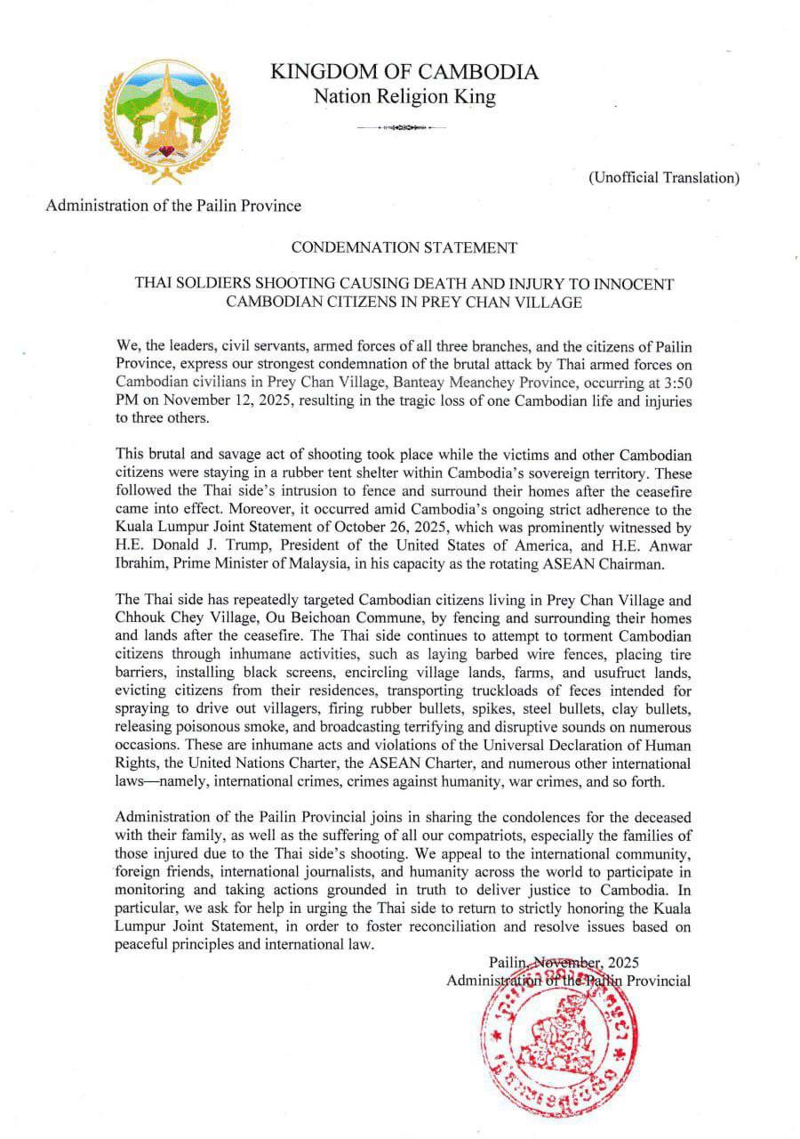 រដ្ឋបាលខេត្តប៉ៃលិន បានសម្ដែងការសោកស្ដាយយ៉ាងខ្លាំង និងប្រកាសថ្កោលទោសយ៉ាងដាច់ខាត ចំពោះអំពើហិង្សារបស់កងកម្លាំងថៃ ដែលបានបើកការបាញ់ប្រហារ មកលើប្រជាជនស៊ីវិលកម្ពុជា ដែលកំពុងរស់នៅក្នុងភូមិព្រៃចាន់ ឃុំអូរបីជាន់ ស្រុកអូរជ្រៅ ខេត្តបន្ទាយមានជ័យ នាវេលាម៉ោង៣៖៥០នាទីរសៀល ថ្ងៃទី១២ ខែវិច្ឆិកា ឆ្នាំ២០២៥ ដែលបណ្តាលឱ្យពលរដ្ឋកម្ពុជា ៣នាក់ រងរបួសធ្ងន់ធ្ងរ និង១នាក់ បាត់បង់ជីវិត។