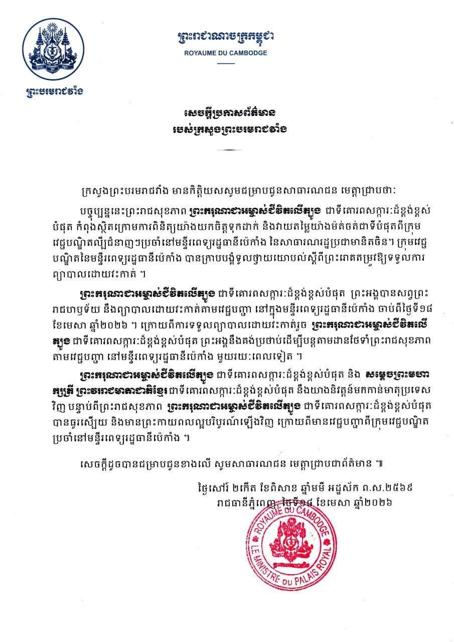 ទូលព្រះបង្គំជាខ្ញុំ សូមសម្តែងនូវក្តីបារម្ភ ក្រោយពីទទួលព័ត៌មានថា ព្រះរោគមហារីកក្រពេញប្រូស្តាត (prostate cancer) របស់ព្រះករុណា ជាអម្ចាស់ជីវិតលើត្បូង ជាទីគោរពសក្ការៈដ៏ខ្ពង់ខ្ពស់បំផុត តម្រូវឱ្យព្រះអង្គទទួលការព្យាបាលដោយការវះកាត់តាមវេជ្ជបញ្ជា នៅមន្ទីរពេទ្យនារដ្ឋធានីប៉េកាំង នៃសាធារណរដ្ឋប្រជាមានិតចិន និងបន្តគង់ប្រថាប់នៅទីនោះមួយរយៈពេល ដើម្បីតាមដានត្រួតពិនិត្យ និងព្យាបាលព្រះរោគ ចាប់ពីថ្ងៃទី១៨ ខែមេសា ឆ្នាំ២០២៦នេះ។