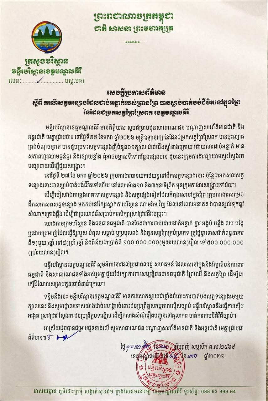 នេះបើតាមសេចក្តីប្រកាសព័ត៌មានស្តីពី ករណីសត្វទន្សោងដែលជាប់អន្ទាក់របស់ព្រានព្រៃ បានស្លាប់បាត់បង់ជីវិតនៅក្នុងព្រៃ នៃដែនជម្រកសត្វព្រៃស្រែពក ខេត្តមណ្ឌលគិរី នាថ្ងៃពុធ ១០កើត ខែមាឃ ឆ្នាំម្សាញ់ សប្តស័ក ពុទ្ធសករាជ ២៥៦៩ ត្រូវនឹងថ្ងៃទី២៨ ខែមករា ឆ្នាំ២០២៦ របស់មន្ទីរបរិស្ថានខេត្តមណ្ឌលគិរី៕
