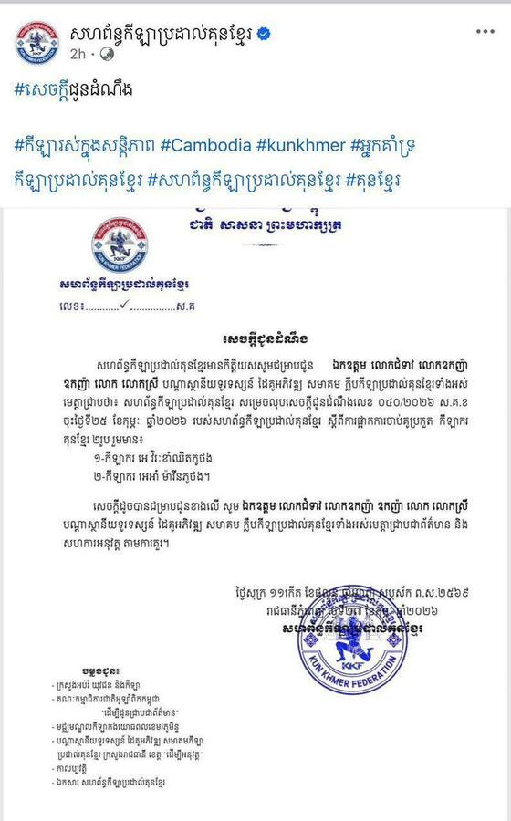 គួរជម្រាបជូនថា នាព្រឹកថ្ងៃដដែលខាងលើ សម្តេចអគ្គមហាសេនាបតីតេជោ ហ៊ុន សែន បានទទូចឲ្យសហព័ន្ធកីឡាប្រដាល់គុនខ្មែរលុបចោលសេចក្តីជូនដំណឹង ពាក់ព័ន្ធនឹងផ្អាកកីឡាករប្រដាល់គុនខ្មែរពីររូបមិនឱ្យចូលរួមការប្រកួតរយៈពេល៦ខែ។